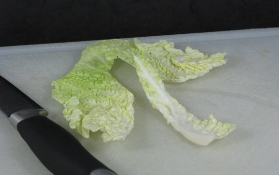 Cut the bottom off of the cabbage and peal the leaves off from the bottom of the cabbage. To prep the cabbage we need to take out the bitter white bit in the middle of the leaf.