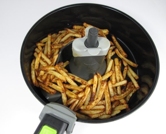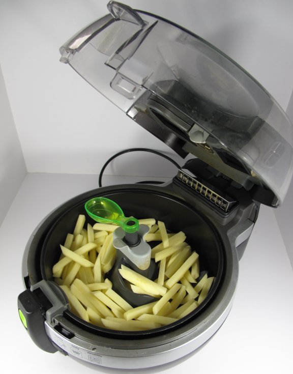 Now at 30 minutes before dinner the potatoes go into the Tefal ActiFry and cover with at most a tablespoon of olive oil. This will produce French Fries at less then 3 percent fat and that fat is olive oil, so almost good for you.