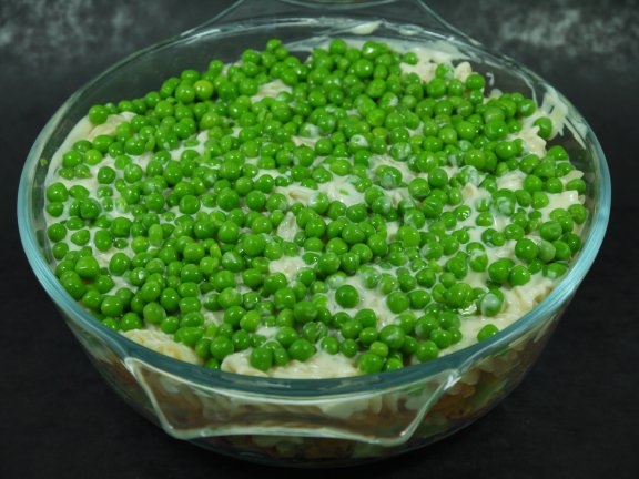 So how many frozen peas, or for that matter how much of anything to make the salad layers? The bowl I use has a lid and I use that as a measuring device. Enough peas, or anything else, to fill the lid will make a layer for the salad.