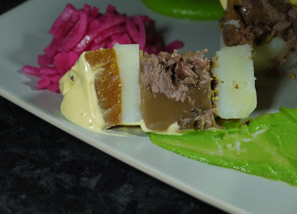 Starting from the bottom there is a disk of potato with whole grain mustard on top. The next layer is the beef in “gravy” then potato again followed by carrot gelatine. Topped off with mustard mayo. On the side there is pea puree and pickled red onions. I think that covers all the ingredients.